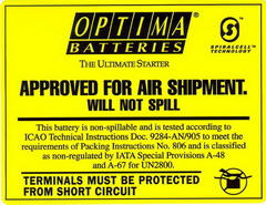 OPTIMA Batterien sind von den wichtigsten internationalen Transportbehörden freigegeben worden:DOT (US Department of Transportation), IATA (International Air Transport Association), ICAO (International Civil Aviation Organization), IMDG (International Maritime Dangerous Goods) und sind von der Transportklasse UN 2800 ausgenommen, weil sie mit Erfolg folgende Tests bestanden haben: 1 - Vibrationstests2 - Unter- und Überdruck3 - Beschädigungen am Gehäuse ohne Austritt von Flüssigkeit