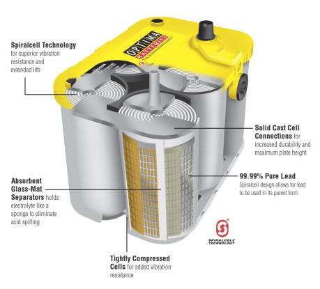 OPTIMA Batterien vereinen mit der einzigartigen Spiralcell-Technologie die fortschrittlichste Stufe der Batterieentwicklung. Die einzigartige Konstruktion in Zylindern ermöglicht eine unvergleichbare Effizienz, mit dreimal höherem Entladestrom, schnellerer Wiederaufladung und gleichbleibender Spannung während der Entladung.Die in Zylindern kompaktierten Energiezellen sind hermetisch abgedichtet, 100% auslaufsicher und es entweicht kein Wasserstoffdampf. Während konventionelle Batterien bei Stößen und Vibrationen intern beschädigt werden und ihren Geist aufgeben, hält die OPTIMA bei Rütteltests bis zu FÜNFZEHN MAL länger. Mit einer Selbstentladung von unter 2% im Monat hält eine voll aufgeladene OPTIMA locker ein halbes Jahr ohne spürbaren Leistungsverlust durch. Selbst nach einem Jahr hat eine OPTIMA noch genügend Kraft, um einen Motor zu starten.Die Lebensdauer einer OPTIMA ist im Durchschnitt zwei- bis dreimal größer als bei einer konventionellen Nassbatterie, Bei guter Wartung sind acht bis zehn Jahre keine Seltenheit!
