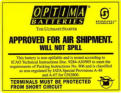 OPTIMA Batterien sind von den wichtigsten internationalen Transportbehörden freigegeben worden:DOT (US Department of Transportation), IATA (International Air Transport Association), ICAO (International Civil Aviation Organization), IMDG (International Maritime Dangerous Goods) und sind von der Transportklasse UN 2800 ausgenommen, weil sie mit Erfolg folgende Tests bestanden haben: 1 - Vibrationstests2 - Unter- und Überdruck3 - Beschädigungen am Behälter ohne Austritt von Flüssigkeit